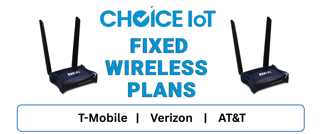 Choice IoT offers Fixed Wireless Data Plans from Verizon , AT&T & T-Mobile all in one platform. Solution Providers use our platform to ensure coverage expansion & redundancy. Manage all major U.S.Carriers in a single pane of glass Avoid multiple lengthy carrier negotiations , long term contracts and volume commitments. We can have you deployed in 24 hours.
